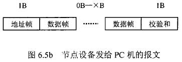 在分體式電磁流量計(jì)等節(jié)點(diǎn)設(shè)備和C機(jī)通信的過程中,由地址幀、命令幀、數(shù)據(jù)幀、校驗(yàn)和可組成各種功能不同的報(bào)文。由于采用主從工作方式來實(shí)現(xiàn)通信,分體式電磁流量計(jì)等節(jié)點(diǎn)設(shè)備僅能接收并執(zhí)行PC機(jī)發(fā)送來的控制命令,而不能發(fā)送命令給PC機(jī)。因此,由PC機(jī)發(fā)往流量計(jì)等節(jié)點(diǎn)設(shè)備的報(bào)文一般包括一個(gè)地址幀,一個(gè)命令幀,若干個(gè)數(shù)據(jù)幀和一個(gè)校驗(yàn)和,其報(bào)文格式圖.6a5所示;而由流量計(jì)等節(jié)點(diǎn)設(shè)備發(fā)往PC機(jī)的報(bào)文一般包括一個(gè)地址幀,若干個(gè)數(shù)據(jù)幀和一個(gè)校驗(yàn)和,其報(bào)文格式如圖6.5b所示。