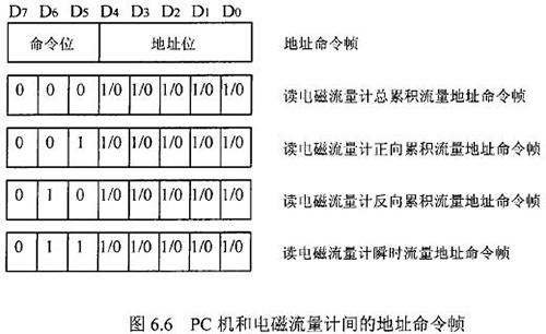 由于RS一485電氣標(biāo)準(zhǔn)規(guī)定每段只能聯(lián)結(jié)犯?jìng)€(gè)節(jié)點(diǎn)設(shè)備,因此可用地址幀中五個(gè)二進(jìn)制位表示這32個(gè)地址,其余3位用來表示命令,從而構(gòu)成地址命令幀。對(duì)于控制命令需求不超過八個(gè)的通信系統(tǒng),采用地址命令幀可壓縮報(bào)文長(zhǎng)度提高通信效率。在污水網(wǎng)絡(luò)監(jiān)控系統(tǒng)中,分體式電磁流量計(jì)和PC機(jī)通信的主要目的是將流量計(jì)中的有用數(shù)據(jù)讀到PC機(jī)中。這些數(shù)據(jù)包括:總累積流量、正向累積流量、反向累積流量、瞬時(shí)流量。通信時(shí),PC機(jī)只需向分體式電磁流量計(jì)發(fā)送讀總累積流量、讀正向累積流量、讀反向累積流量、讀瞬時(shí)流量命令即可,因此二者間通信所用的地址幀和命令幀可合二為一,用一個(gè)地址命令幀代替。PC機(jī)和分體式電磁流量計(jì)間的地址命令幀定義如圖.66所示。根據(jù)污水網(wǎng)絡(luò)監(jiān)控系統(tǒng)中PC機(jī)與分體式電磁流量計(jì)間通信的特殊性,二者通信所使用的報(bào)文可簡(jiǎn)化為圖.67的格式。